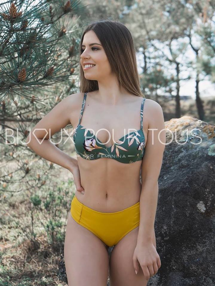 Parte de Cima alça fixa, ajustável. Ata atrás em laço. Contém push up removível, forro 100% poliéster.