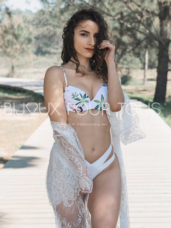 Parte de Cima alça fixa, ajustável. Ata atrás em laço. Contém push up removível, forro 100% poliéster.